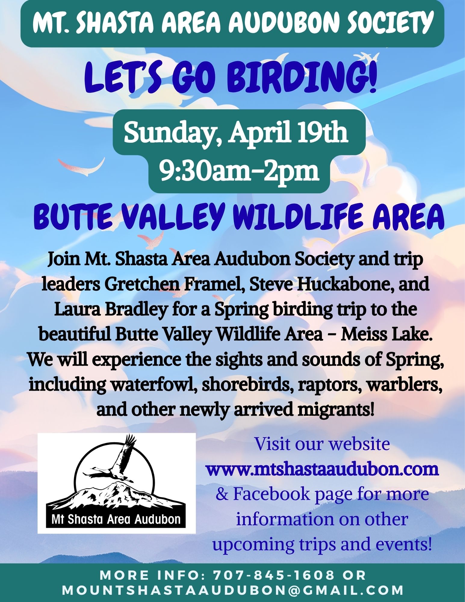 We do our best to keep these pages updated, but the best way to stay up-to-date is to join Mount Shasta Area Audubon Society (see below). You can also find us on Facebook, where we post chapter activities, contact other members, and enjoy birding tips and timely articles. Click here to find Mount Shasta Area Audubon on Facebook.